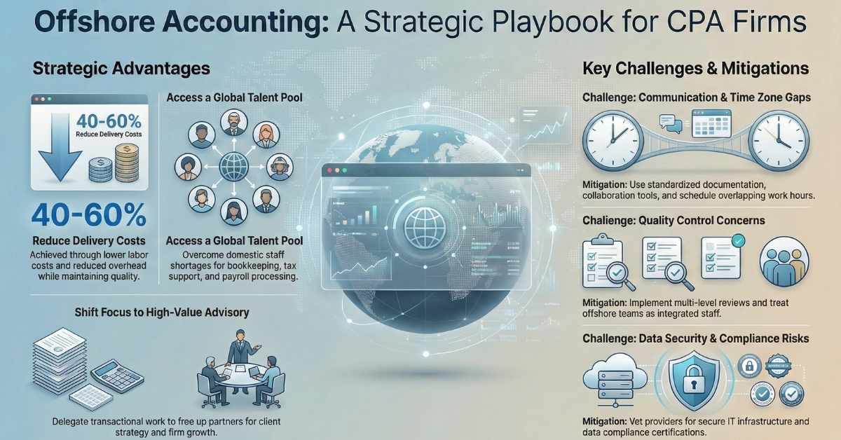 As CPA firms these days are facing a shortage of rising talent, margin pressure, and overwhelming client demands, offshore accounting has emerged as a strategic operating model. It is not just a cost-saving technique anymore. For CPA decision makers, the question is no longer whether offshore accounting should be considered, but how it can help a firm turn into a scalable and advisory-driven one.