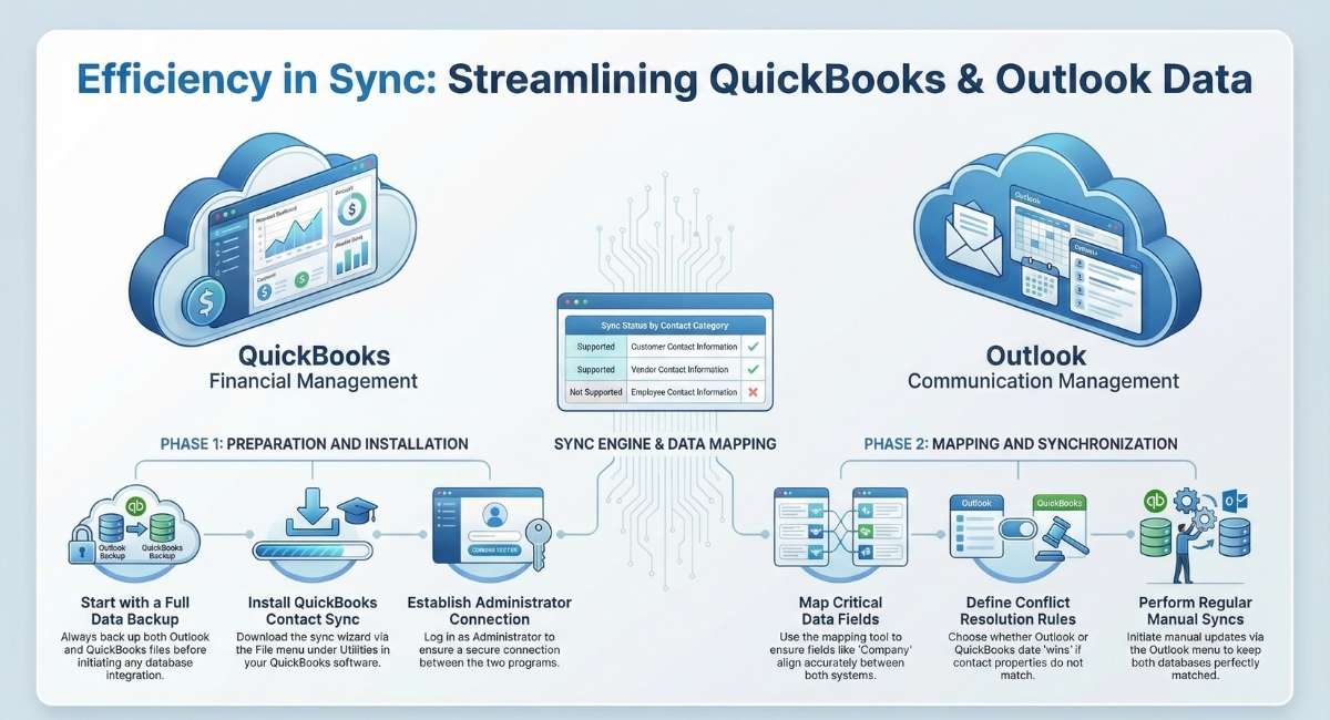 The New Year’s here, the Christmas bills are rolling in, and income taxes loom. Maybe you can’t save money just now, but how about an easy way to save time and keystrokes? If you use Microsoft Outlook 2003, 2007 or 2010 for contact management and QuickBooks Pro, Premier, or Enterprise 2005 and up for financial management, you can synchronize data to avoid entering the same contact information twice.